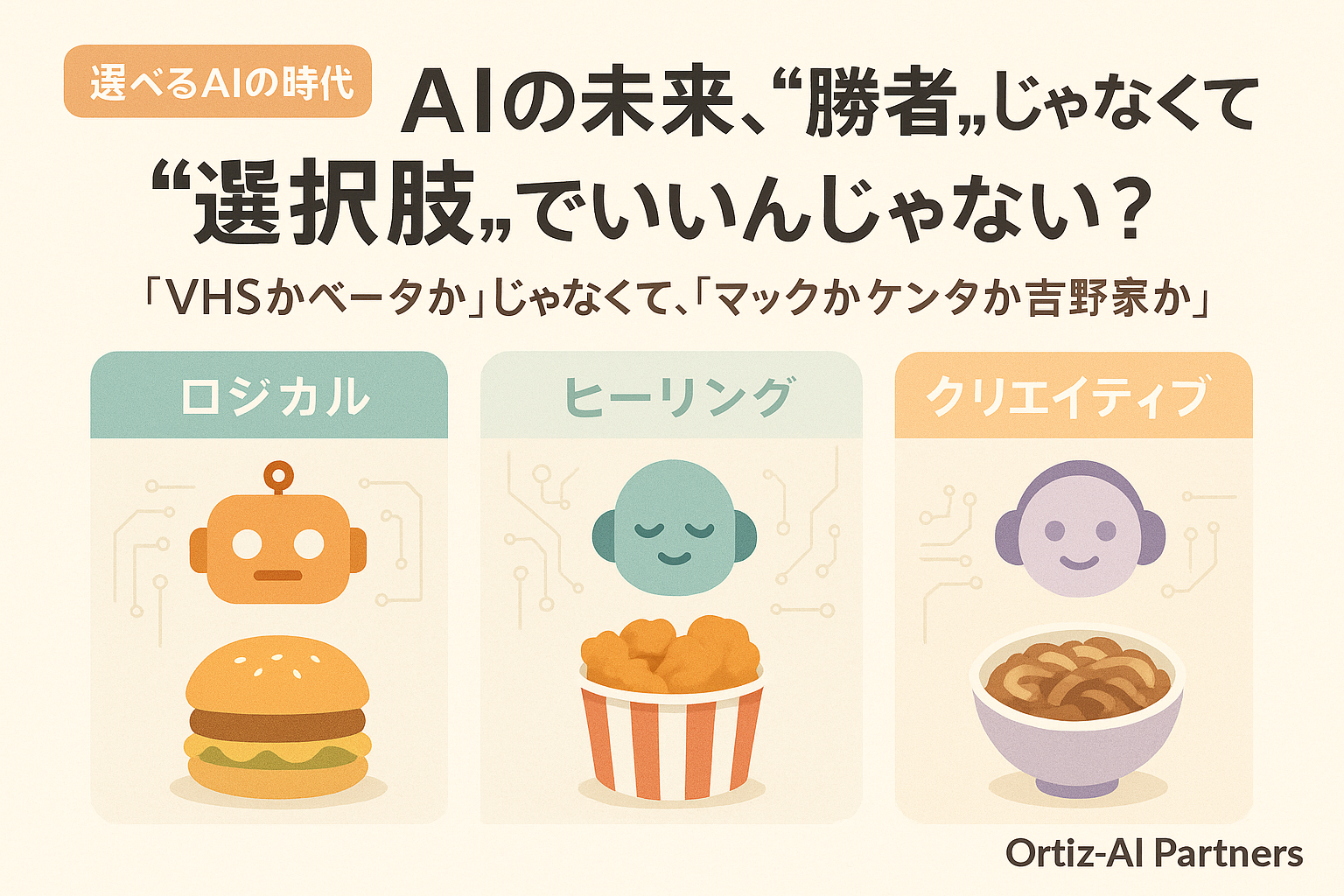 AIの未来、“勝者”じゃなくて“選択肢”でいいんじゃない?ー「VHSかベータか」じゃなくて、「マックかケンタか吉野家か」ー 2025.05.16 ┗開発者の想い yukoroadmin オルティーズAIパートナーズ